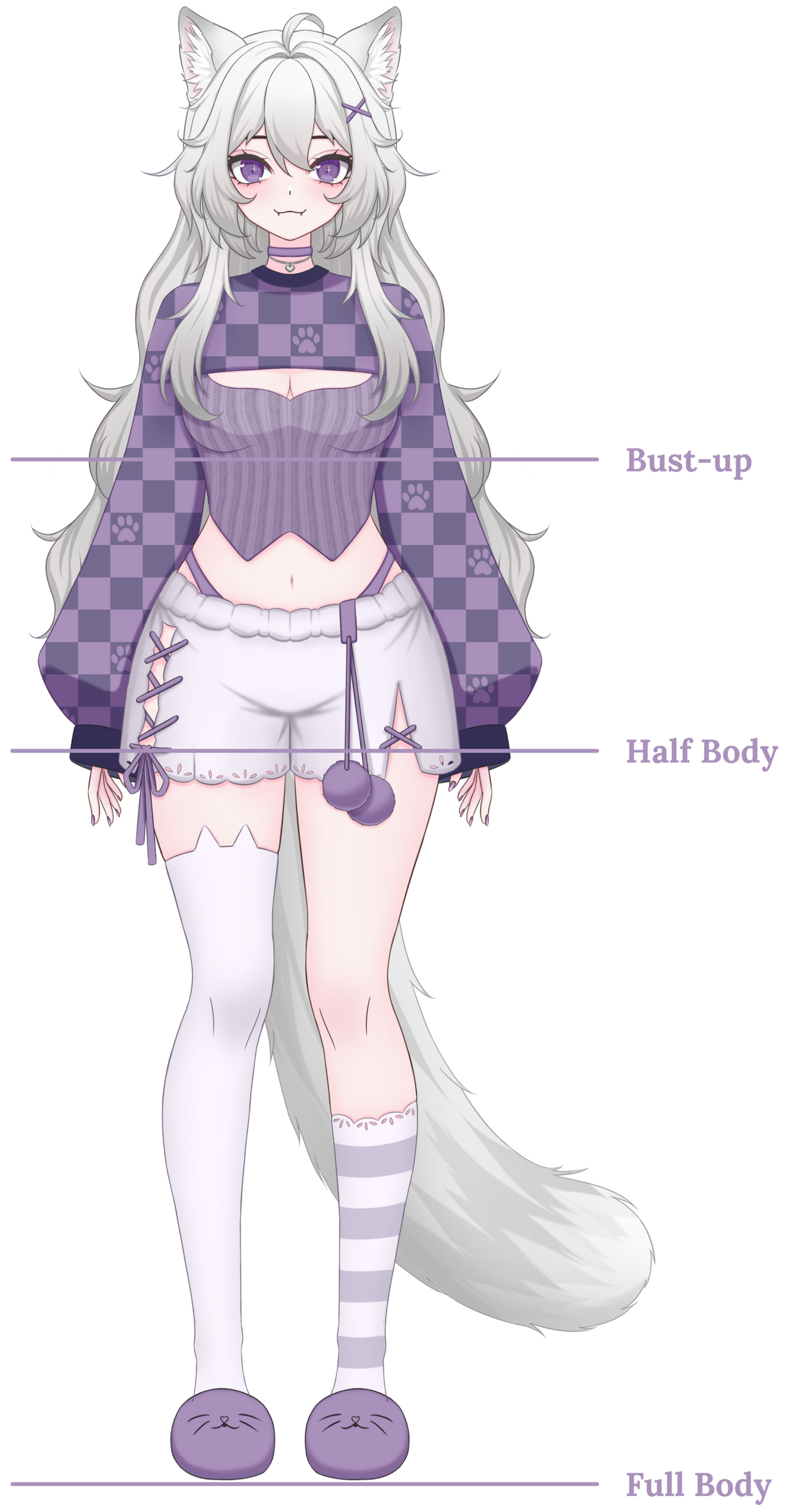 The client must provide clear references and details before the artist begins working on the commission. If the client does not have a character sheet, the artist will provide a document to be filled out with comprehensive details. Any missing details that result in revisions past the base color stage will incur additional charges.